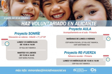 ¡¡¡PROYECTO RE-FUERZA Y PORYECTO AULA!!! - Proyecto Re-Fuerza: Proyecto de refuerzo escolar para menores de Educación Primaria en el CEIP Isla de Tabarca, los LUNES y/o MIÉRCOLES de 15:00 a 16:00h. - Proyecto Aula: Proyecto de apoyo y acompañamiento en el aula a los maestros y las maestras de Educación Primaria de diversos colegios: CEIP Mora Puchol, CEIP Santísima Faz y CEIP Isla de Tabarca. ¡¡Apúntate a uno de estos proyectos y disfruta sirviendo y ayudando a crecer a los más pequeños!! Contacto: 625499660 / mmorales@iniciativasocial.es.